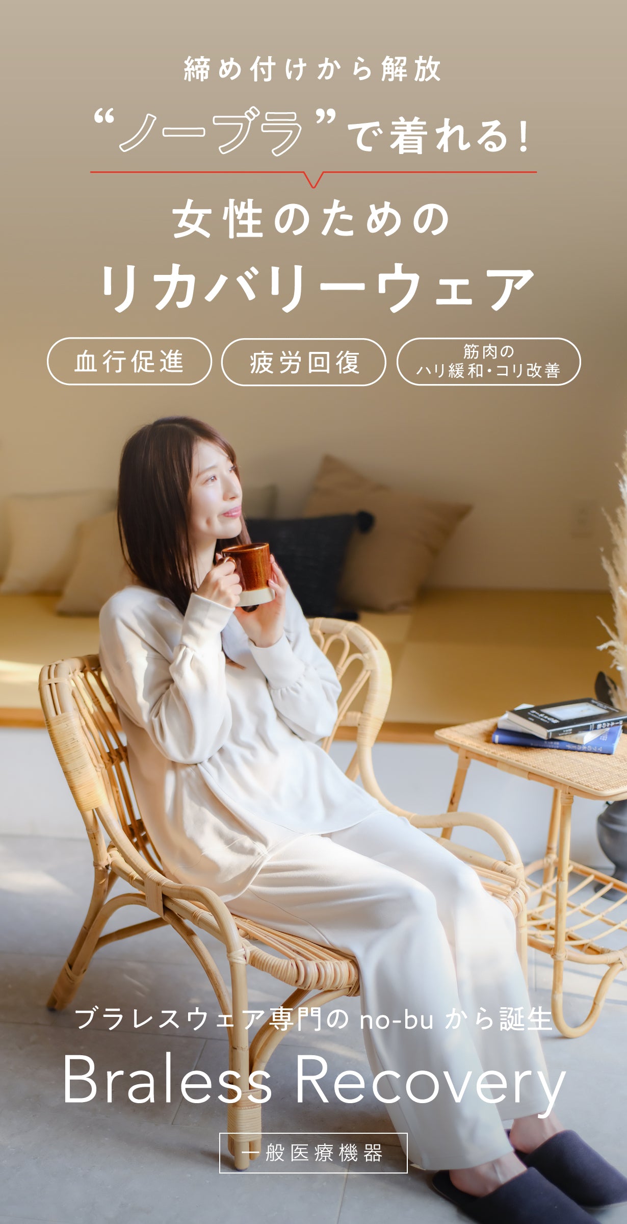 日々、お客様の体を癒す仕事をしているからこそ、自分の体を労わる時間も大切にしています。no-buのブラレスリカバリーは、生地がもっちり柔らかくて、とても気持ちがよくて肌にふれた瞬間からほっとします。ブラをつけずに、ゆるっと過ごしたいリラックスタイムに嬉しいウェアですね。