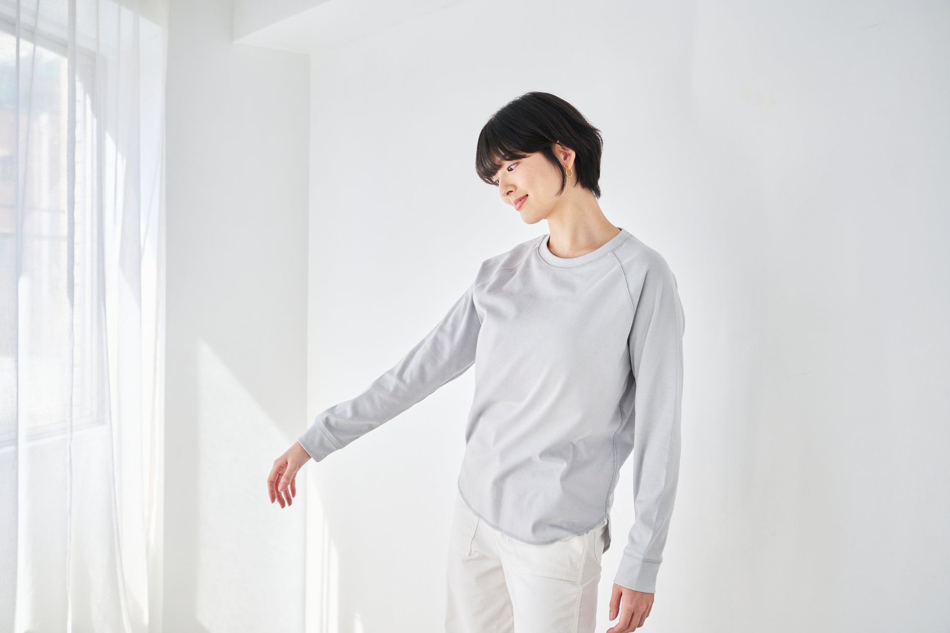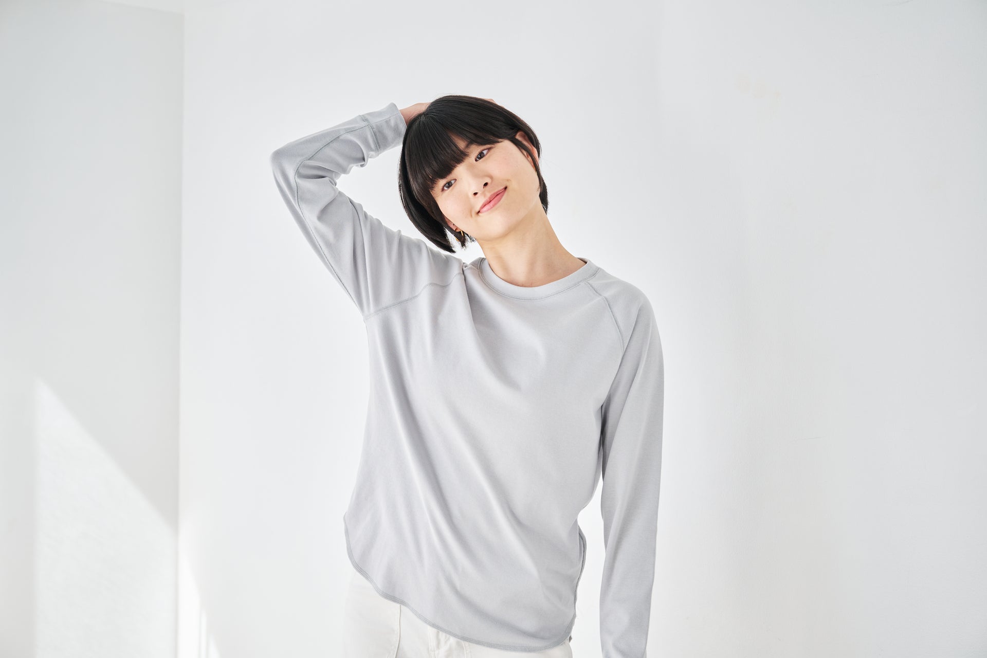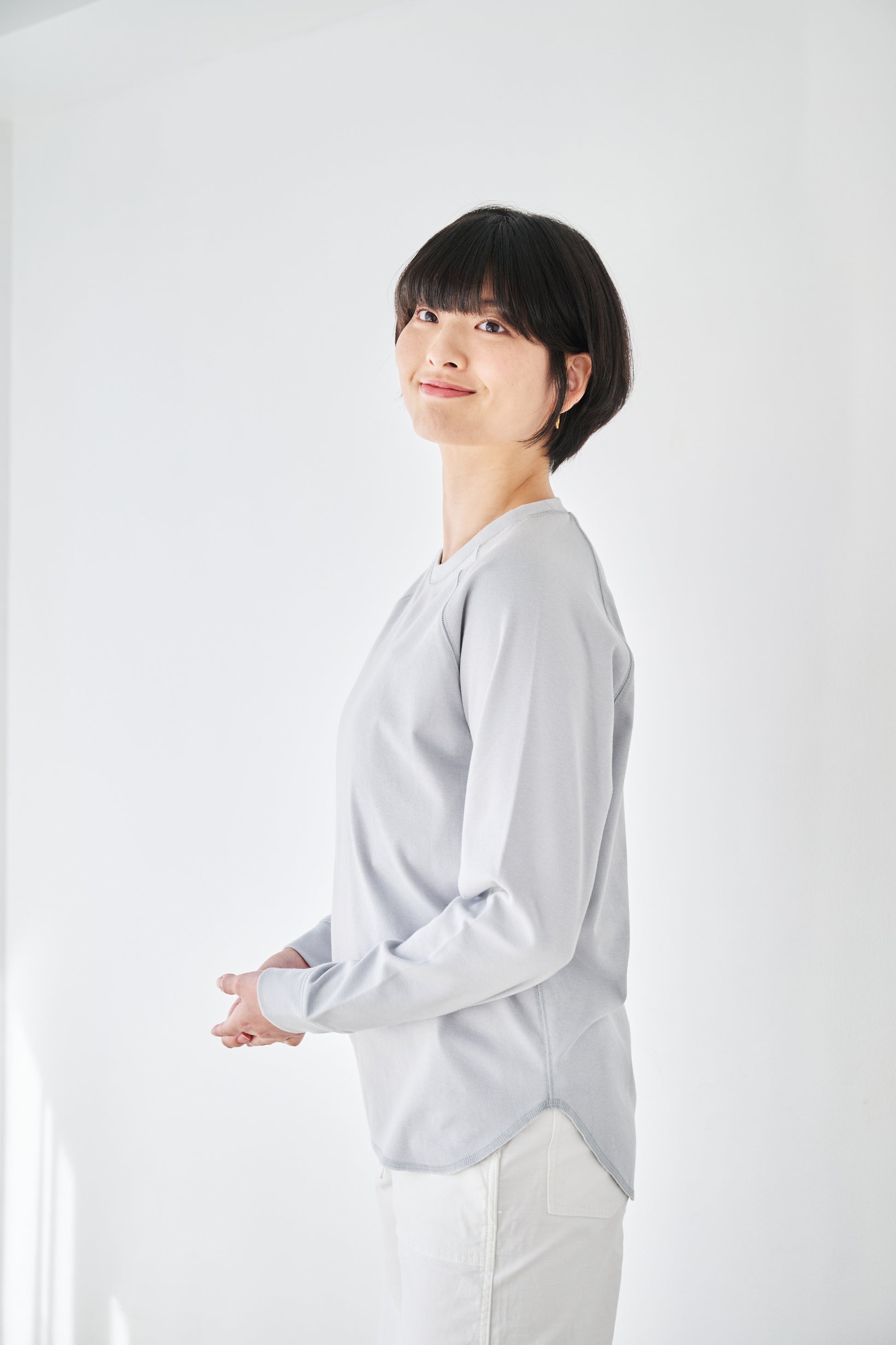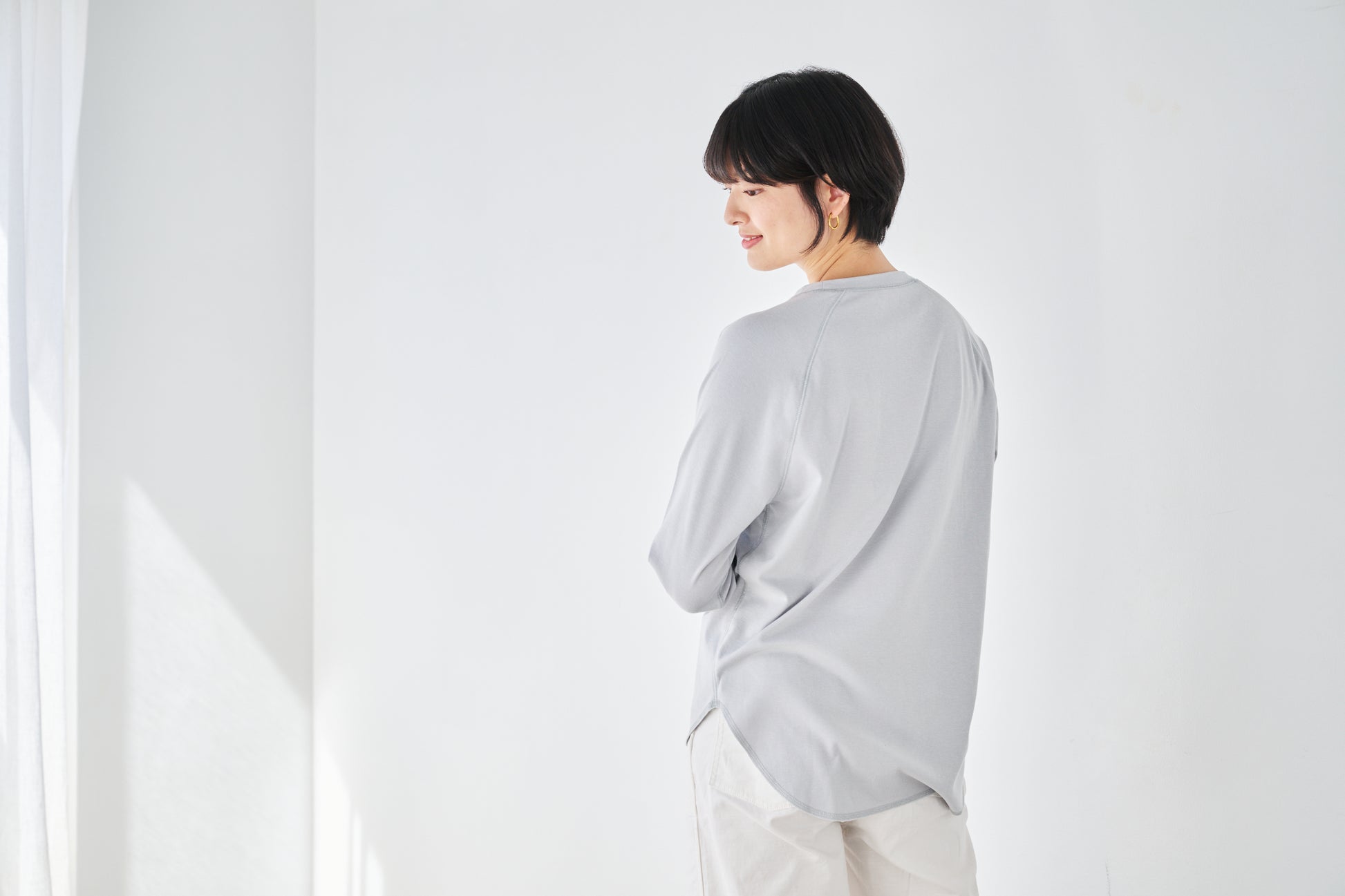 重ね着でも、一枚でも、すっきり整う。