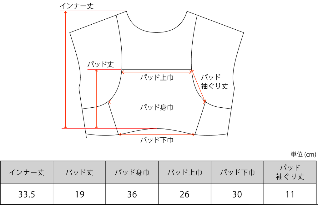 | 素材 | [本体] 身頃 : 綿(80%)、ポリエステル(20%) リブ部分 : ポリエステル(100%) [胸パッド] 裏地 : ポリエステル(95%)、ポリウレタン(5%)、パッド : ポリウレタン(100%) |
